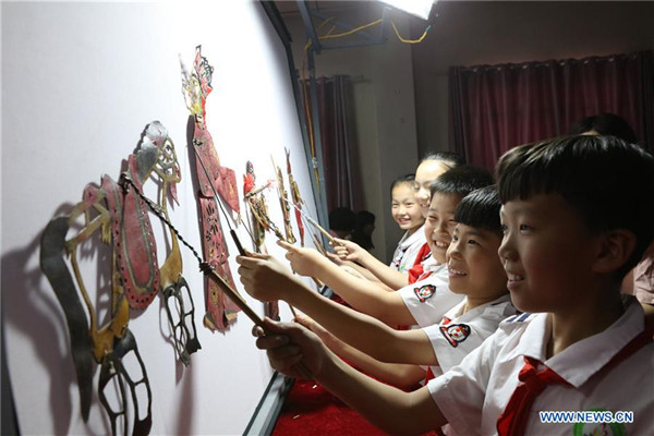 [InKunming--China] Students from a local primary school experience shadow puppet performance in Handan, north China's Hebei Province, July 3, 2019. (Photo by Yang Yang/Xinhua)