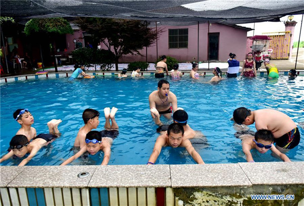 Children learn to swim at a swimming pool in Wuyi County, east China's Zhejiang Province, July 3, 2019. (Photo by Zhang Jiancheng/Xinhua)