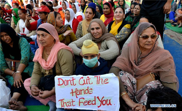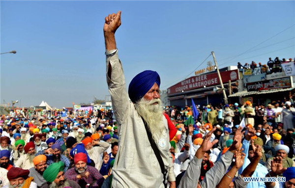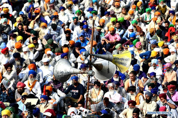 Farmers take part in a protest at Delhi-Haryana Singhu border in India, on Dec. 9, 2020. The farmers protesting against the three new farm laws on Wednesday rejected the federal government's proposals and threatened to intensify their stir by blocking main highways connecting nearby cities to the national capital. (Str/Xinhua)