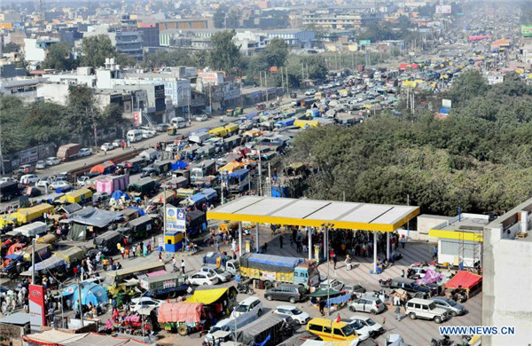 Aerial photo shows heavy traffic during a protest at Delhi-Haryana Singhu border in India, on Dec. 9, 2020. The farmers protesting against the three new farm laws on Wednesday rejected the federal government's proposals and threatened to intensify their stir by blocking main highways connecting nearby cities to the national capital. (Str/Xinhua)