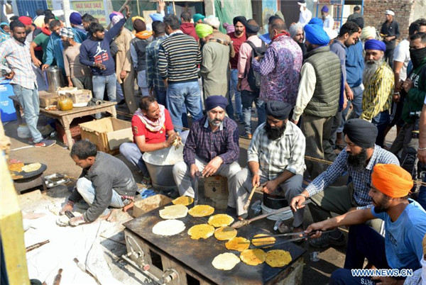 Volunteers prepare food during a protest at Delhi-Haryana Singhu border in India, on Dec. 9, 2020. The farmers protesting against the three new farm laws on Wednesday rejected the federal government's proposals and threatened to intensify their stir by blocking main highways connecting nearby cities to the national capital. (Str/Xinhua)