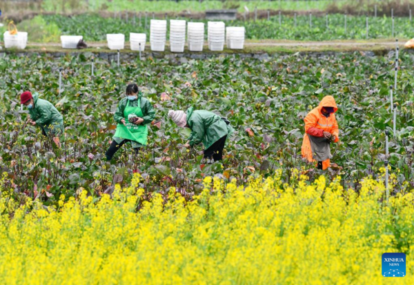 Farmers carry vegetables in the field in Shangpilin Village of Congjiang County, southwest China's Guizhou Province, Feb. 19, 2022. Saturday marks the day of Yushui, or Rain Water, the second of the solar terms. As Yushui arrives, the temperature will rise and rain will become frequent. Farmers across Guizhou are busy with spring agricultural production. (Xinhua/Yang Wenbin)