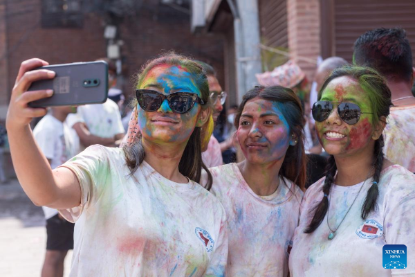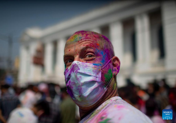 People celebrate Holi, the festival of colors, in Kathmandu, Nepal, March 17, 2022. (Photo by Sulav Shrestha/Xinhua)