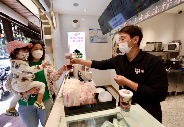 A consumer buys tea at a shop in Shanghai's Jinshan district on Monday. [Photo by ZHU XINGXIN/CHINA DAILY]