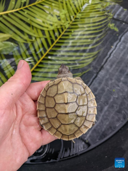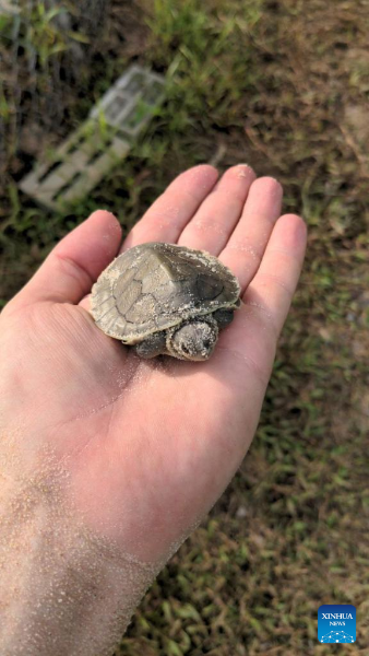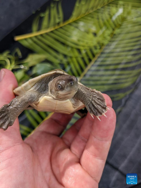 Photo taken on May 8, 2022 shows a rare Royal Turtle baby in Koh Kong province, Cambodia. Thirty nearly extinct Royal Turtle babies hatched in an artificial sandbank at the Koh Kong Reptile Conservation Center (KKRCC) in southwest Cambodia's Koh Kong province last week, a conservationist group said on Friday.(WCS/Handout via Xinhua)
