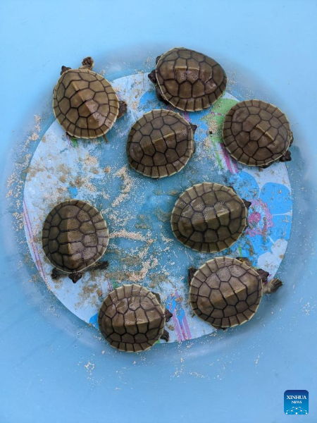 Photo taken on May 8, 2022 shows rare Royal Turtle babies in Koh Kong province, Cambodia. Thirty nearly extinct Royal Turtle babies hatched in an artificial sandbank at the Koh Kong Reptile Conservation Center (KKRCC) in southwest Cambodia's Koh Kong province last week, a conservationist group said on Friday.(WCS/Handout via Xinhua)
