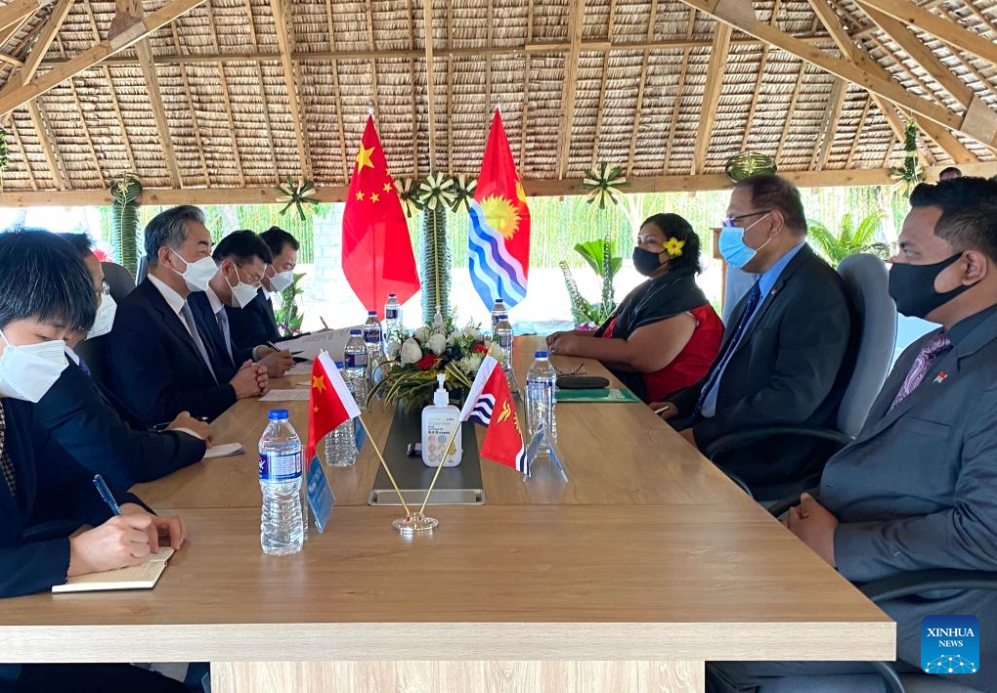 Kiribati Vice President Teuea Toatu (2nd R) meets with Chinese State Councilor and Foreign Minister Wang Yi (3rd L) in Tarawa, Kiribati, May 27, 2022. (Xinhua)