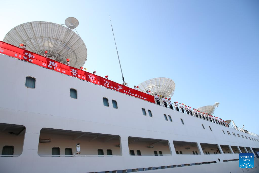 Chinese Ambassador to Sri Lanka Qi Zhenhong (3rd L, front) and captain of Yuanwang-5 Zhang Hongwang (2nd L, front) attend the welcoming ceremony of China's space-tracking ship Yuanwang-5 at Sri Lanka's Hambantota International Port in Hambantota, Sri Lanka, Aug. 16, 2022.