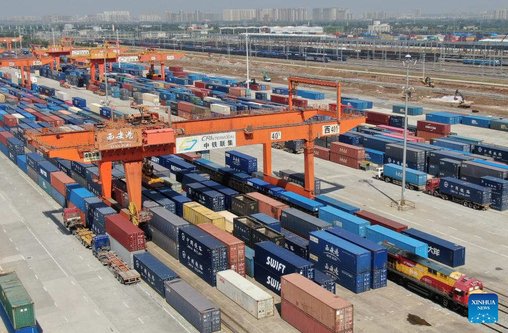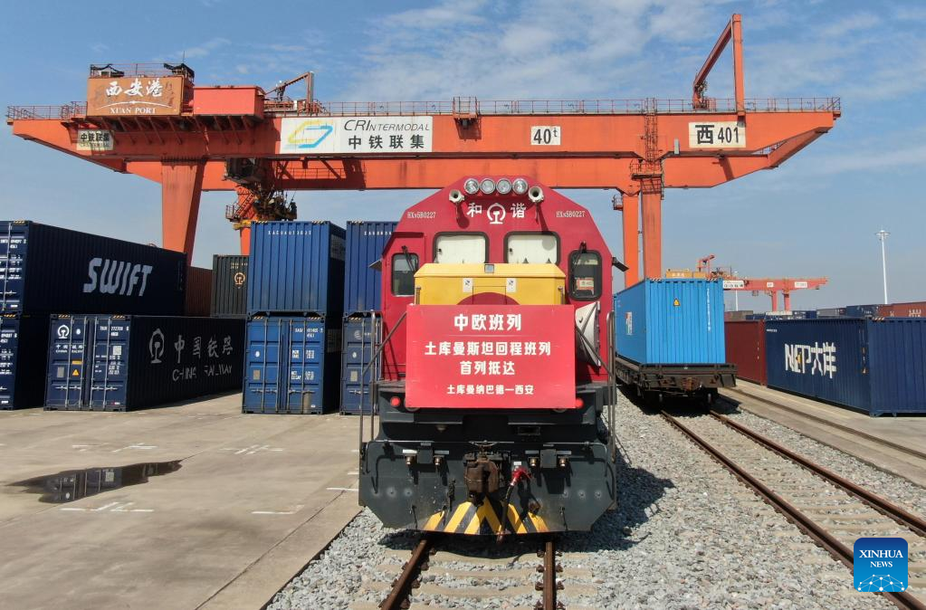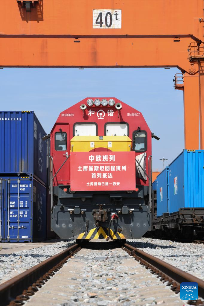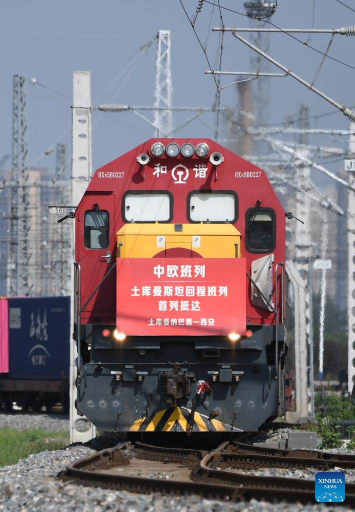 A China-Europe freight train arrives at Xi'an international port in Xi'an, northwest China's Shaanxi Province, Aug. 31, 2022. The freight train loaded with raw materials of liquorice, a Chinese medicinal herb, which departed from Turkmenistan, arrived at the Xi'an international port in Shaanxi Province on Wednesday. (Xinhua/Li Yibo)