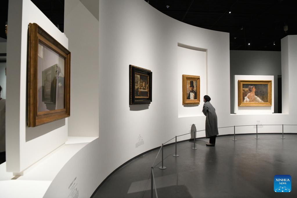 A visitor views exhibits at an exhibition of modern and contemporary European artworks in Chengdu Museum in Chengdu, southwest China's Sichuan Province, Nov. 25, 2022. An exhibition of modern and contemporary European artworks kicked off Friday in the southwestern Chinese city of Chengdu. (Xinhua/Tang Wenhao)