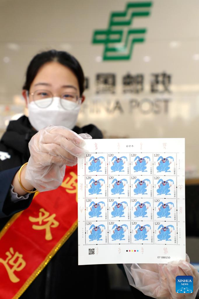 A staff member of China Post displays the special stamps marking the Year of the Rabbit in Dongying, east China's Shandong Province, Jan. 5, 2023. China Post on Thursday released a set of two special stamps to celebrate the upcoming Chinese zodiac Year of the Rabbit. (Photo by Liu Zhifeng/Xinhua)