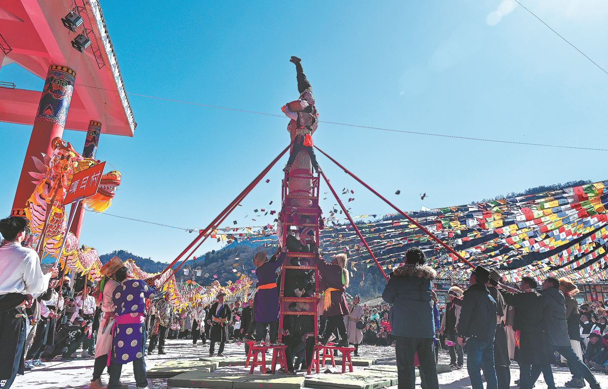 Tourists watch an acrobatic performance in celebration of a Tibetan festival in Baoxing, Sichuan province, on Monday. [Photo by He Haiyang/For China Daily]