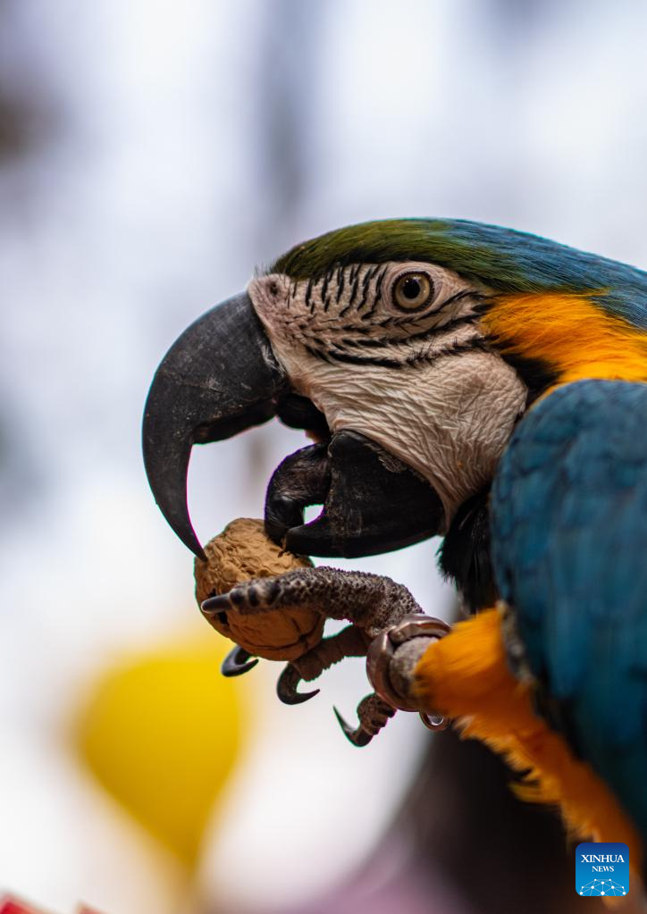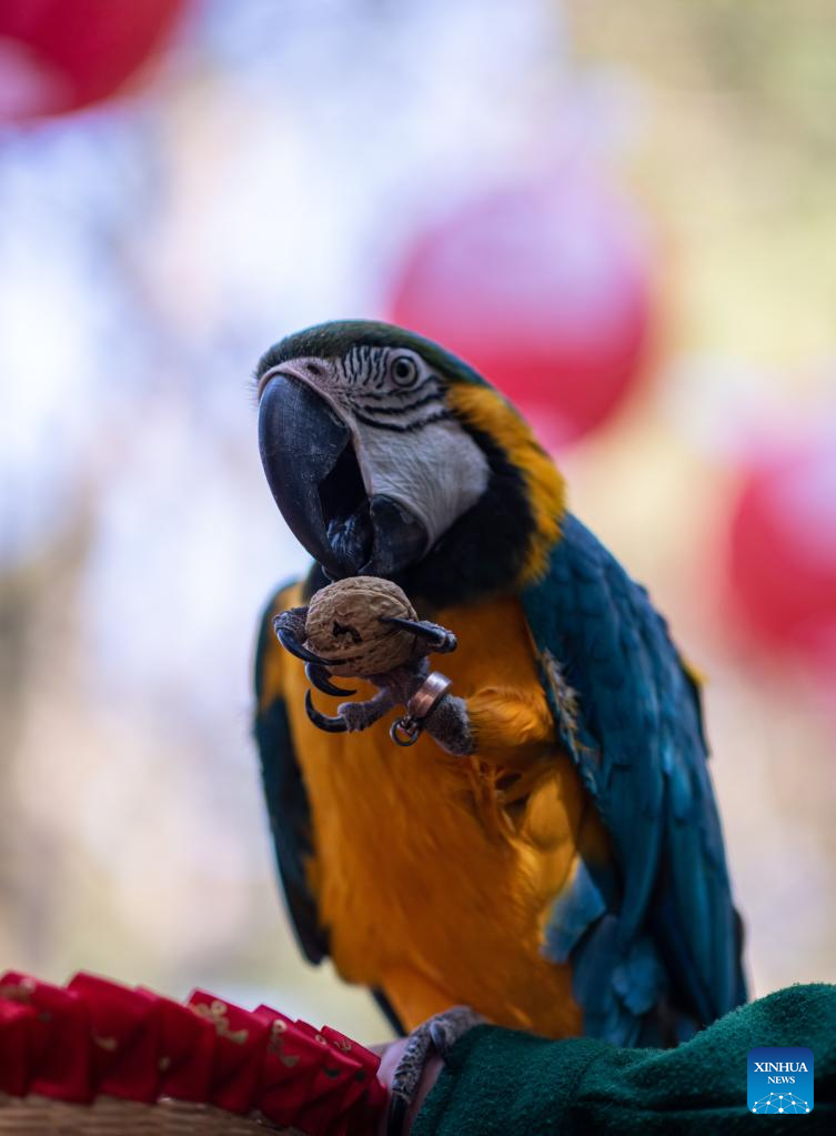 A macaw enjoys a nut as "festive food" ahead of the upcoming Lantern Festival at Yunnan Wild Animal Park in Kunming, southwest China's Yunnan Province, Feb. 4, 2023. (Xinhua/Jiang Wenyao)