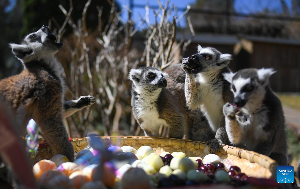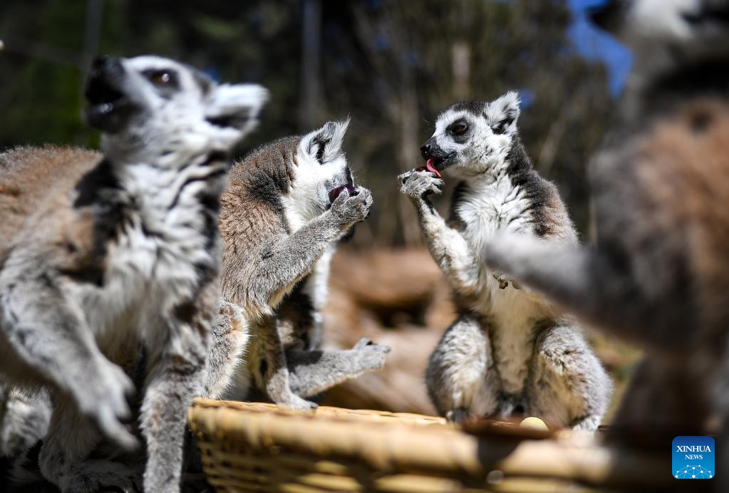 Lemurs enjoy "festive food" ahead of the upcoming Lantern Festival at Yunnan Wild Animal Park in Kunming, southwest China's Yunnan Province, Feb. 4, 2023. (Xinhua/Jiang Wenyao)