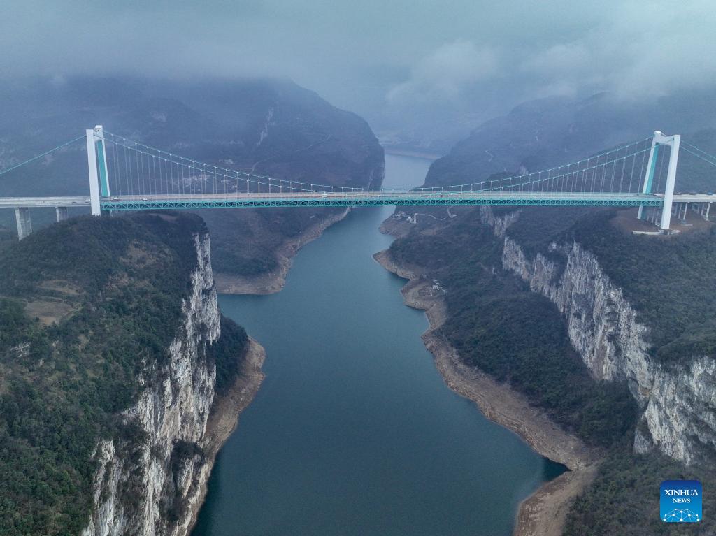 This aerial photo taken on Feb. 2, 2023 shows the Dafaqu grand bridge in southwest China's Guizhou Province. Guizhou has nearly half of the 100 tallest bridges in the world. Due to the large number of bridges, their types and complex technologies used in the construction of the bridges, the province is known as "the museum of world bridges". (Xinhua/Ou Dongqu)