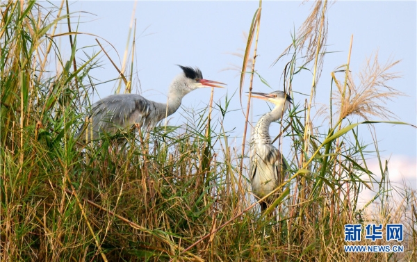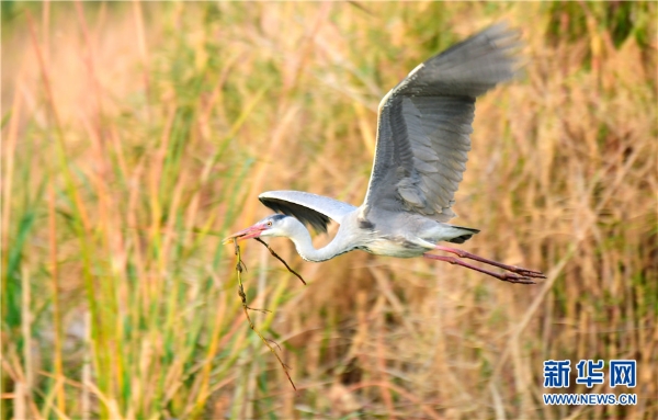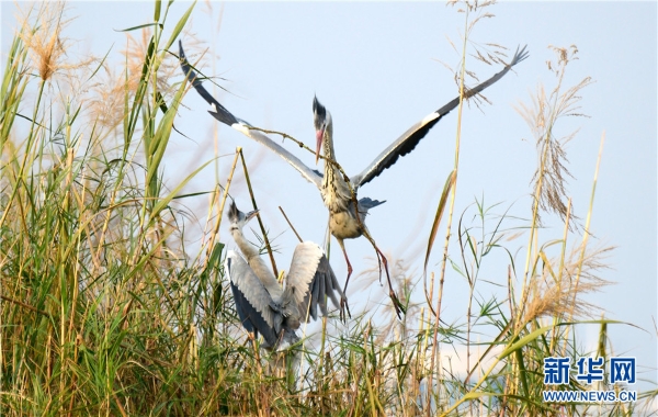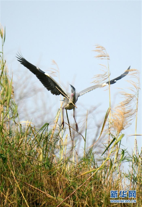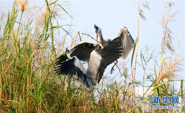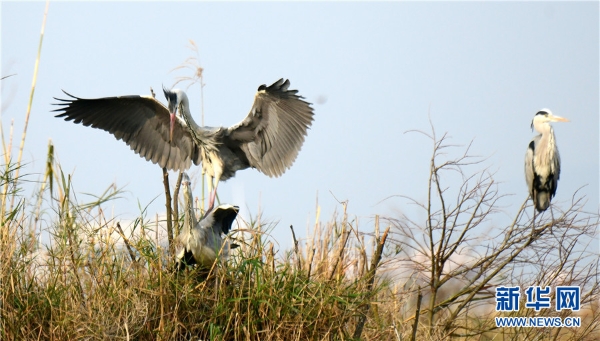 The photo taken on Feb.15 shows herons are busing building a nest with branches in Mile’s Huquan Ecological Park in Yunnan. (Xinhua/Pu Jiayong)