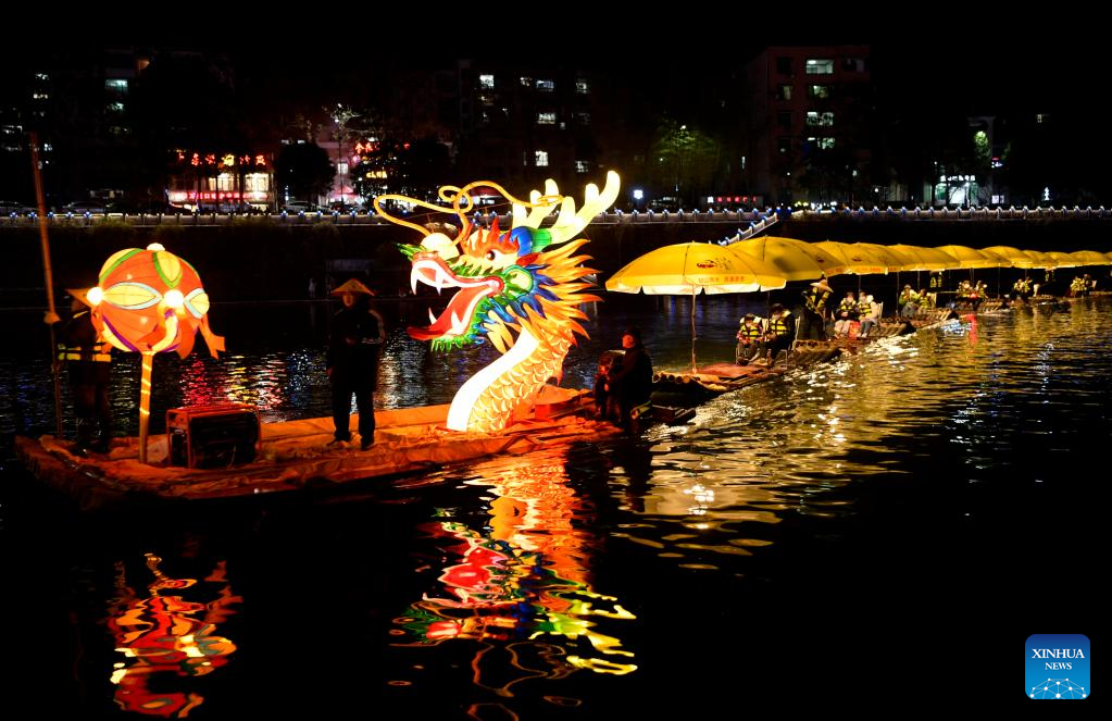 People take sightseeing boats at a scenic spot in Xuan'en County, central China's Hubei Province, Jan. 28, 2023. Xuan'en County has built footpaths, fountains and snack booths along the Gongshui River to boost nighttime economy. (Photo by Wang Jun/Xinhua)