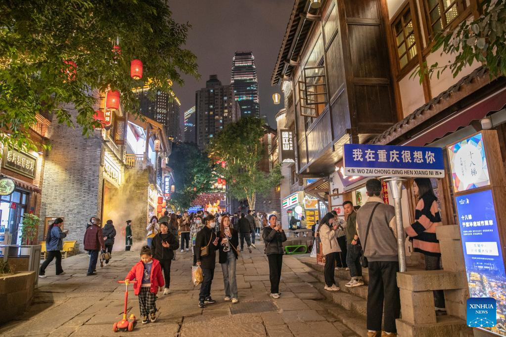 Tourists visit a commercial street in Yuzhong District in southwest China's Chongqing Municipality, Feb. 10, 2023. Chongqing has launched a variety of activities at nighttime to boost night economy since the beginning of this year. (Xinhua/Huang Wei)