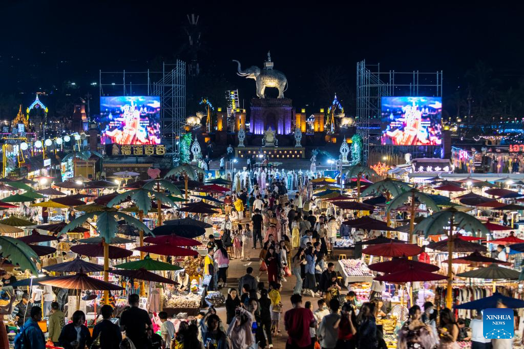 This photo taken on Feb. 12, 2023 shows a night fair in Jinghong City of Xishuangbanna Dai Autonomous Prefecture, southwest China's Yunnan Province.