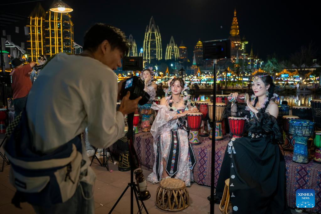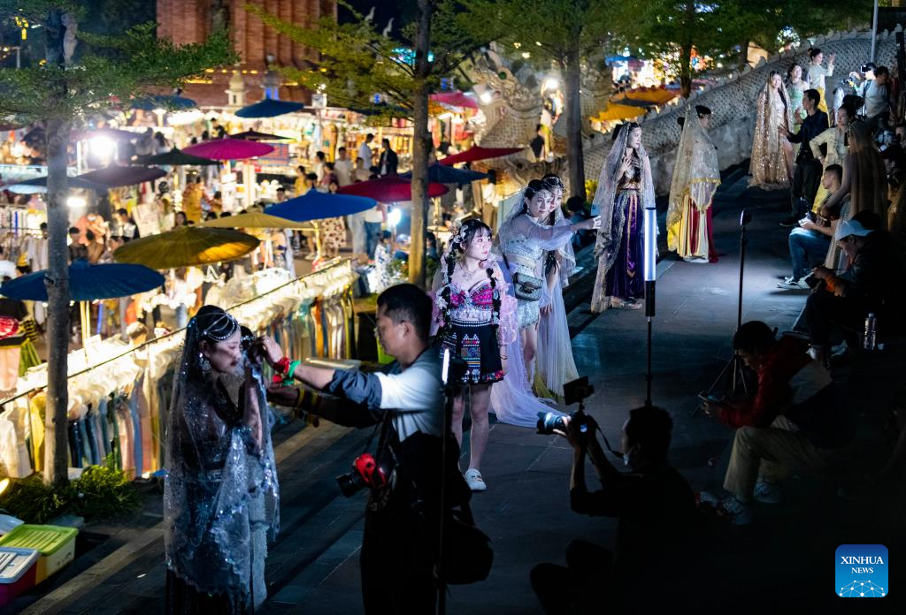 Photographers take photos for tourists at a night fair in Jinghong City of Xishuangbanna Dai Autonomous Prefecture, southwest China's Yunnan Province, Feb. 12, 2023.