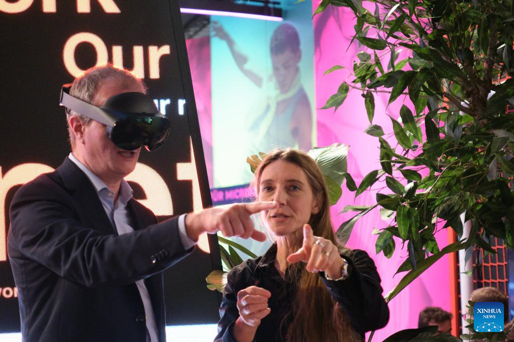 A visitor tries on a VR headset at the 2023 edition of the Mobile World Congress (MWC) in Barcelona, Spain, on Feb. 27, 2023. The 2023 edition of the Mobile World Congress (MWC) kicking off Monday in Barcelona saw a strong return of Asian participants, according to the organiser of the city's largest annual event. (Xinhua/Meng Dingbo)