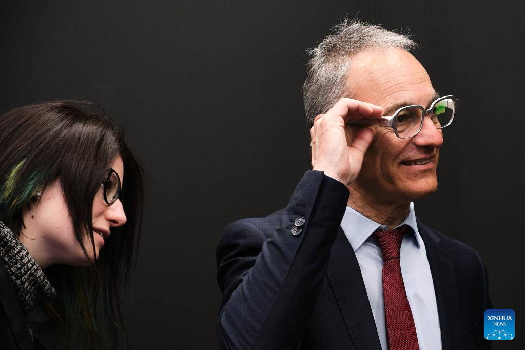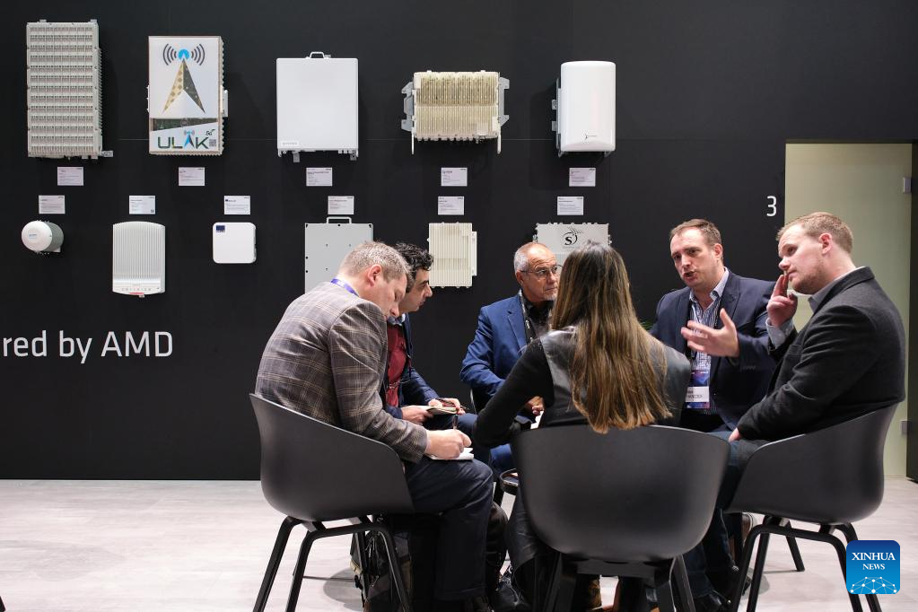 People communicate at the 2023 edition of the Mobile World Congress (MWC) in Barcelona, Spain, on Feb. 27, 2023. The 2023 edition of the Mobile World Congress (MWC) kicking off Monday in Barcelona saw a strong return of Asian participants, according to the organiser of the city's largest annual event. (Xinhua/Meng Dingbo)