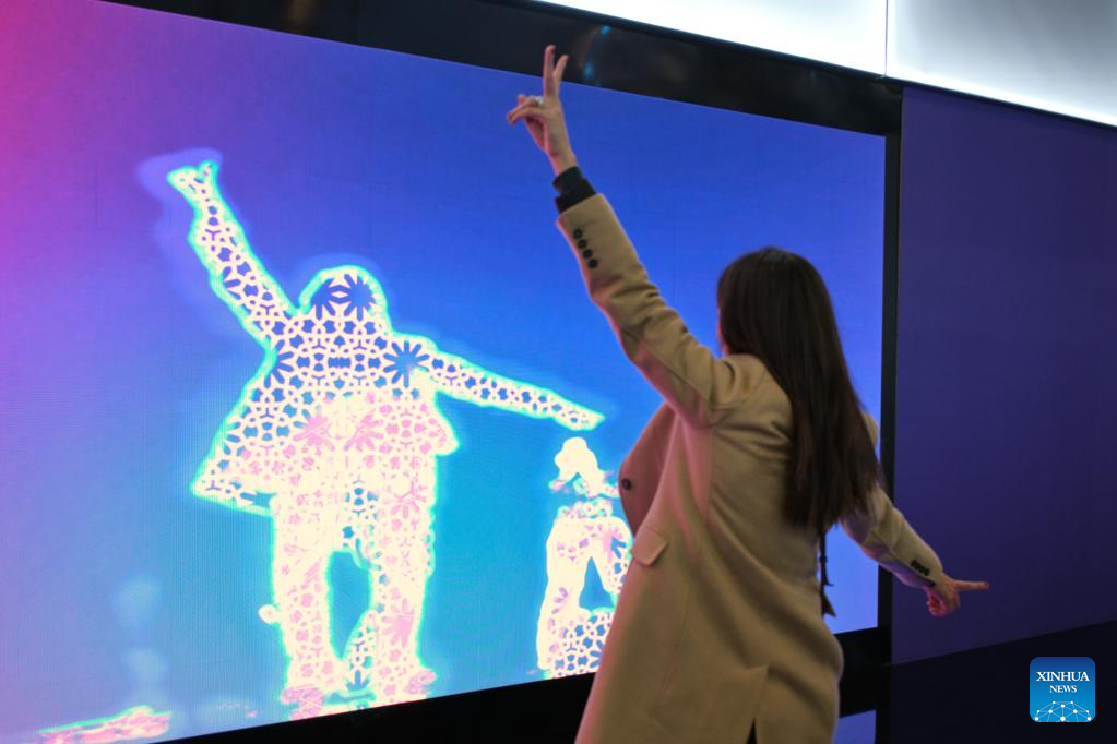 A visitor gestures in front of a screen showing her image with thermal imaging technology at the 2023 edition of the Mobile World Congress (MWC) in Barcelona, Spain, on Feb. 27, 2023. The 2023 edition of the Mobile World Congress (MWC) kicking off Monday in Barcelona saw a strong return of Asian participants, according to the organiser of the city's largest annual event. (Xinhua/Meng Dingbo)