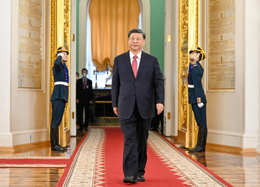 Chinese President Xi Jinping walks into the St. George's Hall at the Kremlin in Moscow, Russia, March 21, 2023. Xi on Tuesday held talks with Putin in Moscow. Putin held a solemn welcome ceremony for Xi Jinping at the St. George's Hall. (Xinhua/Xie Huanchi)