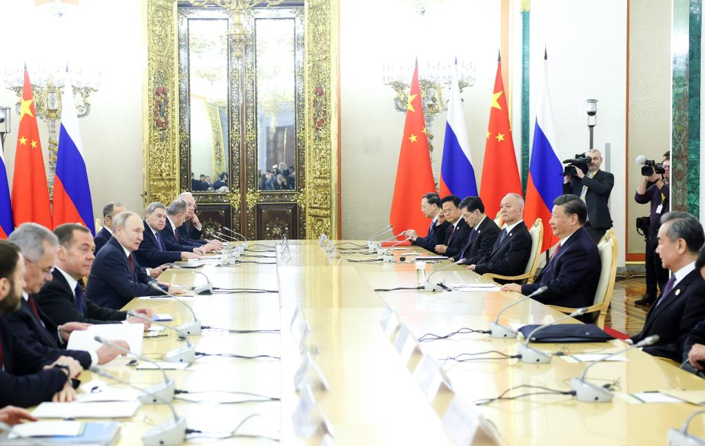 Chinese President Xi Jinping and Russian President Vladimir Putin hold large-group talks at the Kremlin in Moscow, Russia, March 21, 2023. Xi on Tuesday held talks with Putin in Moscow. (Xinhua/Shen Hong)