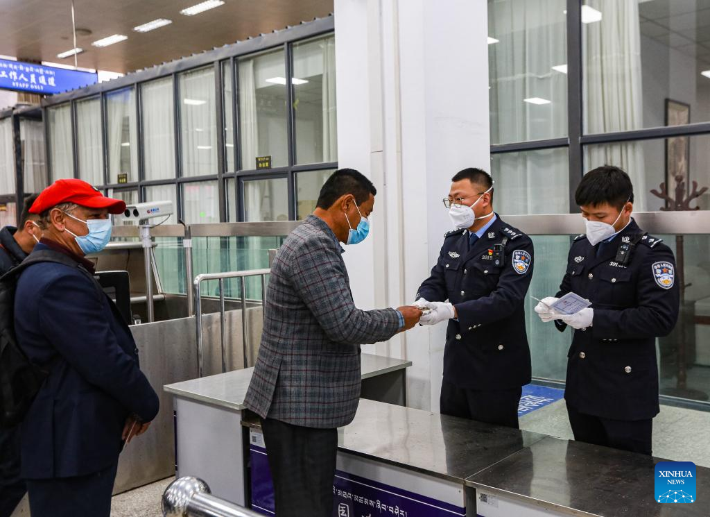 Passengers have their credentials checked at the Gyirong port in southwest China's Tibet Autonomous Region, April 1, 2023. (Photo by Xiao Fugui/Xinhua)