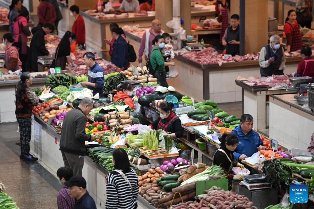 People shop for vegetables at a market in Nanning, south China's Guangxi Zhuang Autonomous Region, April 11, 2023. China's consumer prices registered a mild growth in March, in sharp contrast to the persistent global inflation, official data showed.