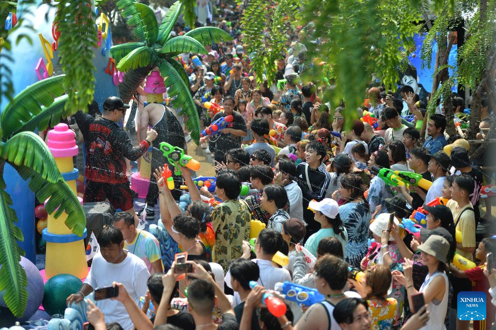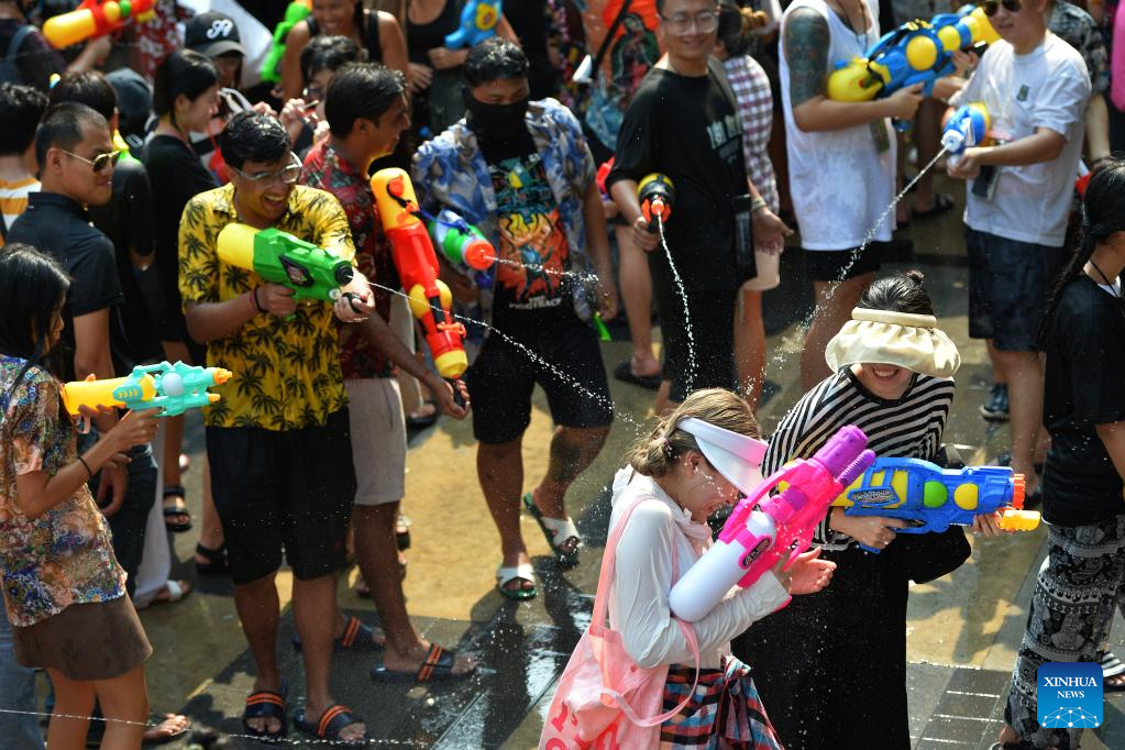 People attend water fight to celebrate the Songkran Festival in Bangkok, Thailand, April 13, 2023. Songkran Festival, the traditional Thai New Year, is celebrated from Thursday to Saturday, during which people express greetings by splashing water on each other. (Xinhua/Wang Teng)