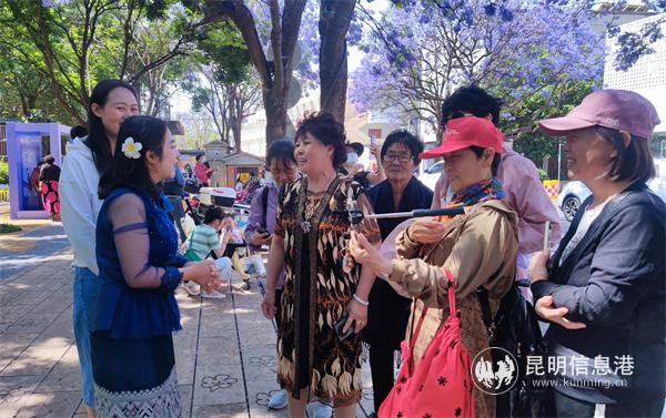 "Sisters, come over here and take pictures. The flowers here are beautiful," shouted Grandma Li, who is nearly seventy years old, to her good friends. Grandma Li is a native of Kunming and this year she invited friends from other provinces to come and see the jacaranda trees in Kunming. As she said, "I have lived in Kunming all my life and have been to other places, but I can't stay away from Kunming. I just love here." Speaking of the upcoming May Day holiday, Grandma Li immediately recommended Kunming, "Come to see the jacaranda flowers under the blue sky and enjoy the mild climate. You'll know it once you're here!"