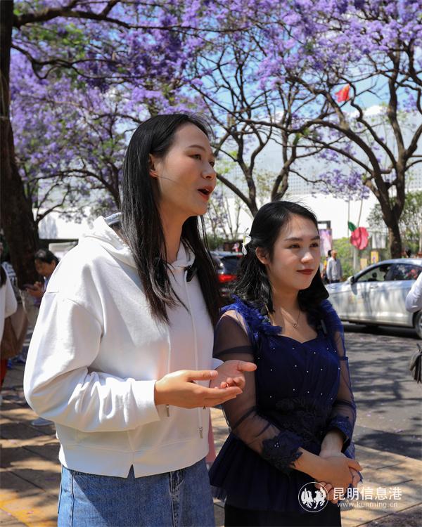 "It's really beautiful! If I have the chance, I would definitely bring my family and friends to see the jacaranda trees. Since the China-Laos Railway Cross-border Train has been opened, Laotians can take the train directly to Kunming to visit the jacaranda avenue and experience the life people have been longing for," said Vieng, like Grandma Li, she hoped that more people would come to Kunming, especially friends from Southeast Asian countries. She said that there are few jacaranda trees in Laos and other Southeast Asian countries, so the beauty of these unique purple flowers is something that locals have never seen before.
