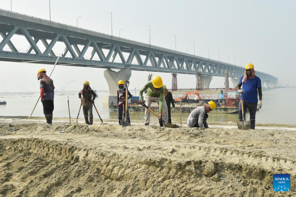 Workers are pictured at a site of the Padma Multipurpose Bridge Project River Training Works (PMBP-RTW) project in Munshiganj on the outskirts of Dhaka, Bangladesh, on May 31, 2023. (Xinhua)