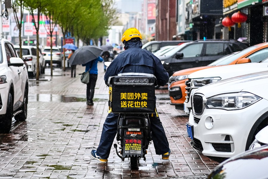 An express courier delivers take-away food on a rainy day in Jilin City, northeast China's Jilin Province, April 28, 2023. (Xinhua/Yan Linyun)