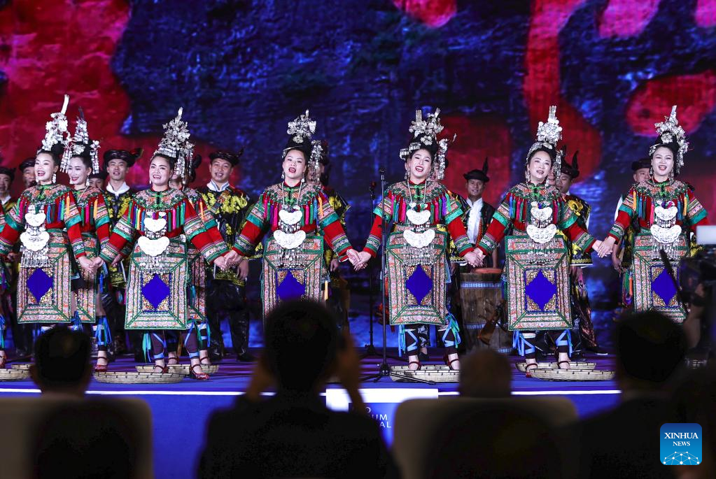 Artists sing songs of Dong ethnic group at the closing ceremony of the Eco Forum Global Guiyang 2023 in Guiyang, southwest China's Guizhou Province, July 9, 2023.