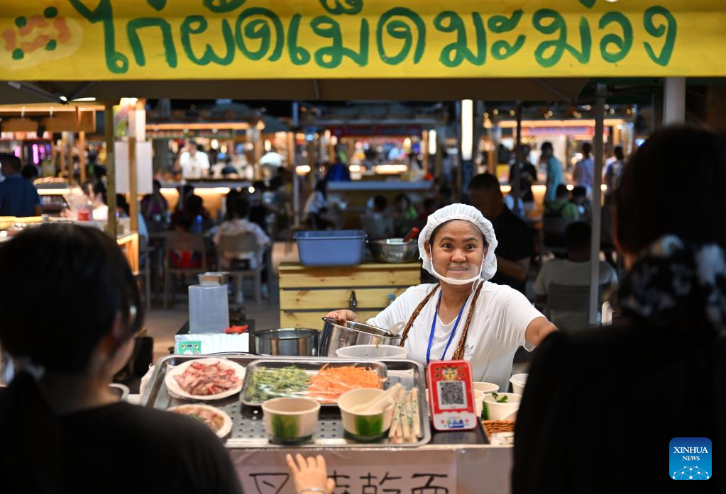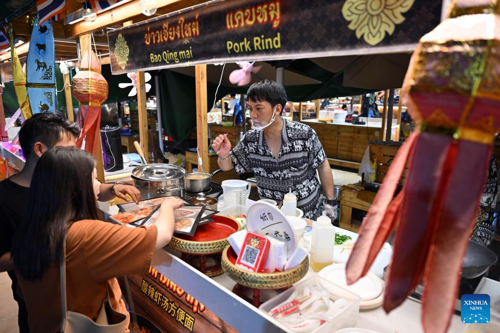 People buy snacks at a Thai food stall of the Baishamen cultural and creative bazaar in Haikou, south China's Hainan Province, July 5, 2023. (Xinhua/Guo Cheng)