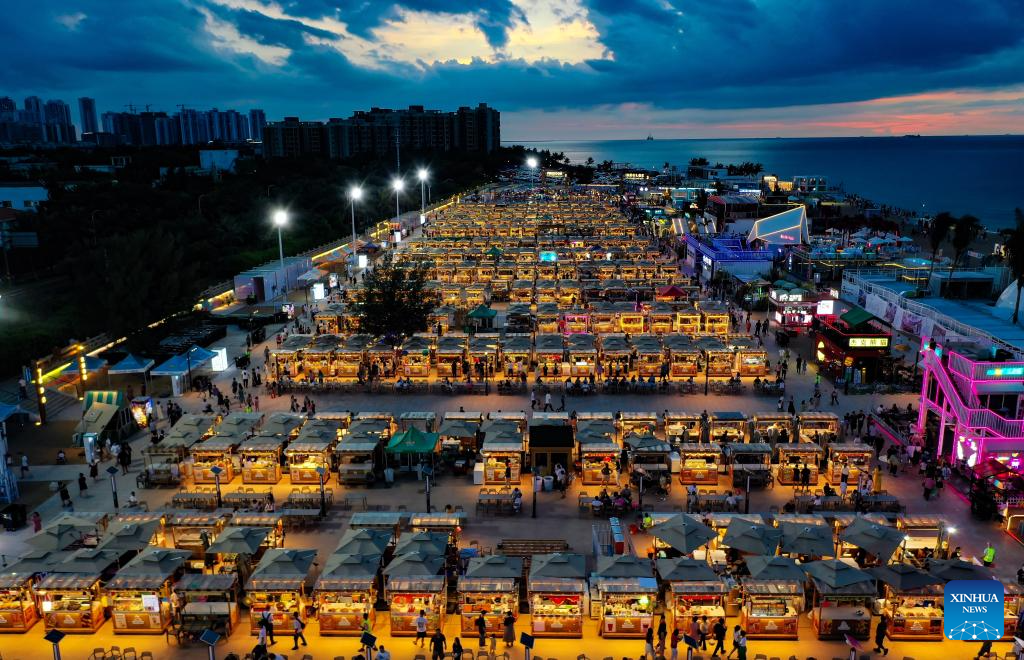 As night falls, the Baishamen cultural and creative bazaar in Haikou, the capital of south China's island province of Hainan, bursts into bustle, and the special greetings from the Thai food stalls bring tourists a Thai ambiance.
