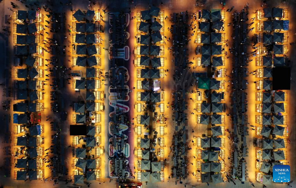 This aerial photo taken on July 5, 2023 shows the Baishamen cultural and creative bazaar in Haikou, south China's Hainan Province. (Xinhua/Guo Cheng)