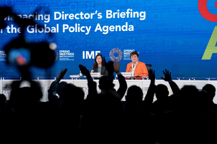 Managing Director of the International Monetary Fund (IMF) Kristalina Georgieva (R, back) attends a press conference in Washington, D.C., the United States, on April 13, 2023. (Xinhua/Liu Jie)