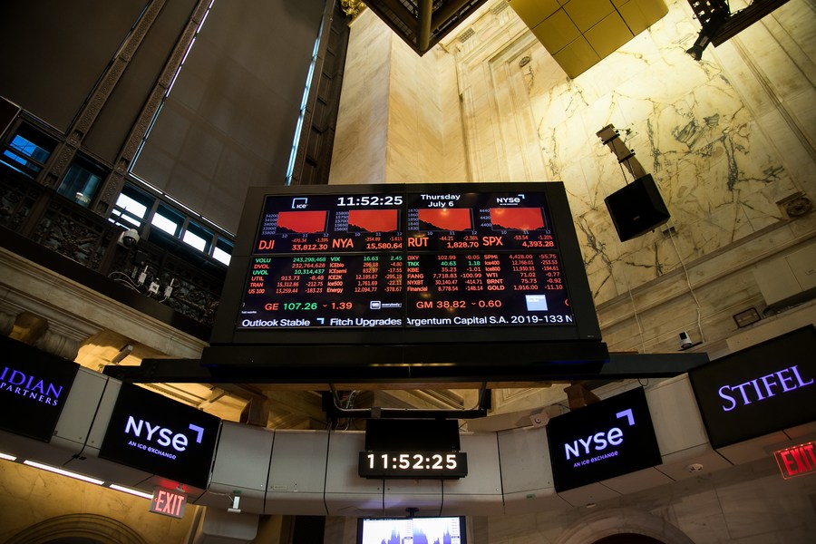 A screen displays stock market information at the New York Stock Exchange (NYSE) in New York, the United States, on July 6, 2023. (Xinhua/Michael Nagle)