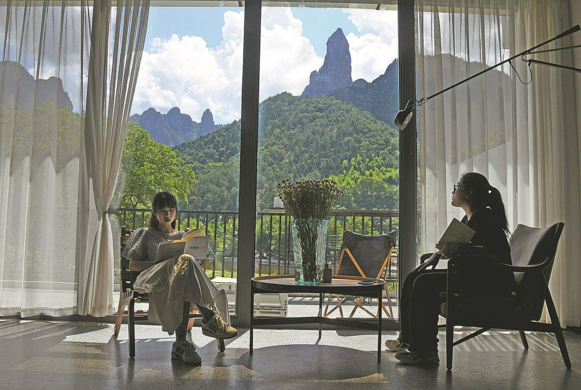 Tourists enjoy leisure time at a rural tea-themed homestay venue in Taizhou, Zhejiang province, in July. [WANG HUABIN/FOR CHINA DAILY]