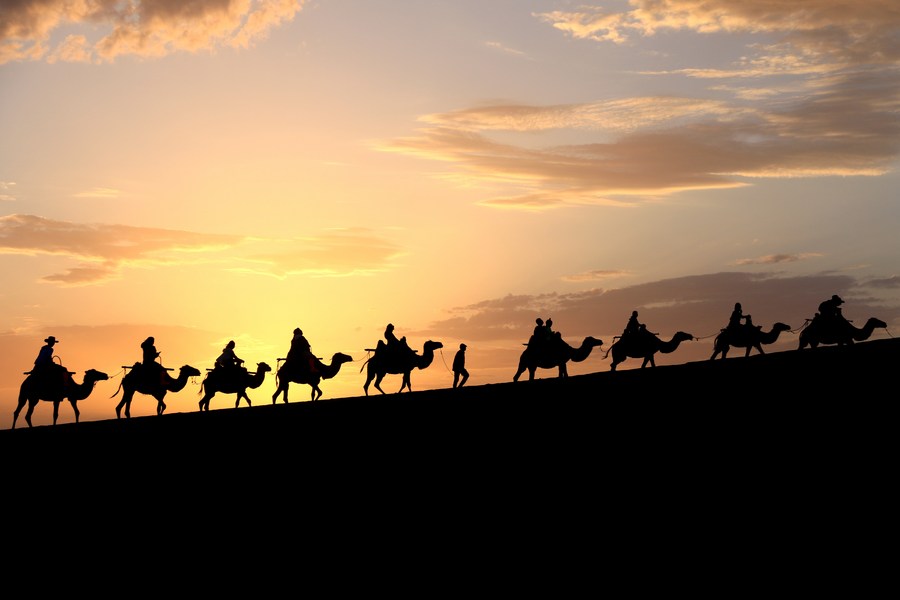 Tourists ride camels at the Mingsha Mountain and Crescent Spring scenic spot in Dunhuang, northwest China's Gansu Province, July 15, 2023. (Photo by Zhang Xiaoliang/Xinhua)