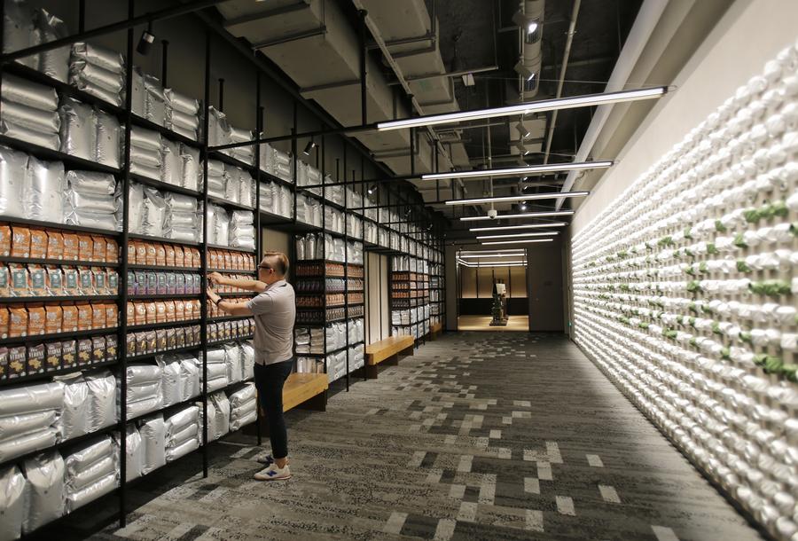 A staff member arranges coffee bean products on shelves at the Starbucks China Coffee Innovation Park in Kunshan, east China's Jiangsu Province, Sept. 18, 2023. (Xinhua/Liu Wenhui)