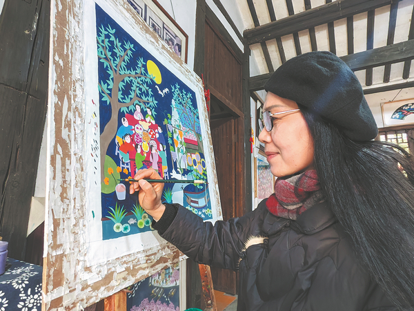 Jinshan folk artist Chen Huifang works on her new illustrated book Golden Childhood.[Photo/CHINA DAILY]