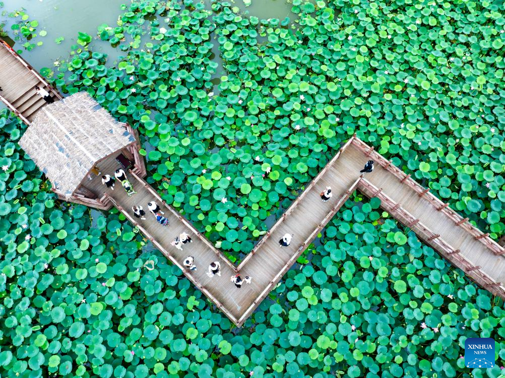 Tourists visit a wetland scenic spot of Weishan Lake in Tengzhou, east China's Shandong Province, July 14, 2024. Many tourist destinations across China have recently seen a surge in visitors as the country enters its peak summer tourist season. (Photo by Li Zhijun/Xinhua)