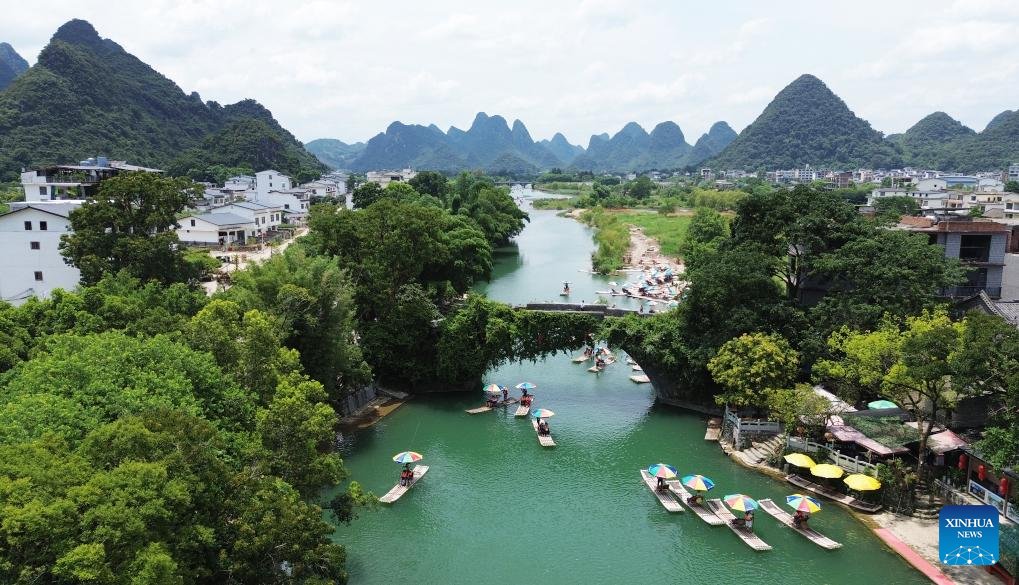 An aerial drone photo taken on July 14, 2024 shows tourists riding on bamboo rafts in a river of Yangshuo County, Guilin City, south China's Guangxi Zhuang Autonomous Region. Many tourist destinations across China have recently seen a surge in visitors as the country enters its peak summer tourist season. (Photo by Liao Zuping/Xinhua)