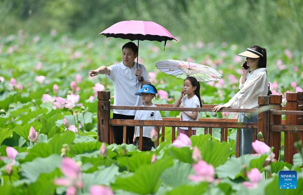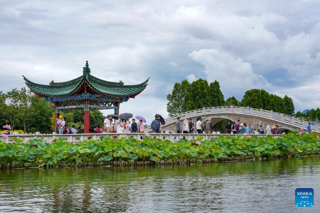 Tourists enjoy lotus flowers at Daguan Park in Kunming, southwest China's Yunnan Province, July 13, 2024. Many tourist destinations across China have recently seen a surge in visitors as the country enters its peak summer tourist season. (Photo by Hao Yaxin/Xinhua)