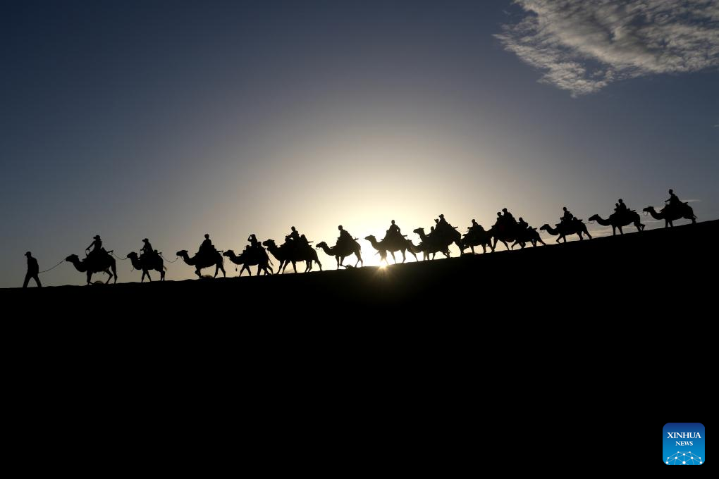 Tourists ride camels at the Mingshashan and the Crescent Lake, an oasis scenic spot in the Gobi Desert in Dunhuang, northwest China's Gansu Province, July 14, 2024. Many tourist destinations across China have recently seen a surge in visitors as the country enters its peak summer tourist season. (Photo by Zhang Xiaoliang/Xinhua)